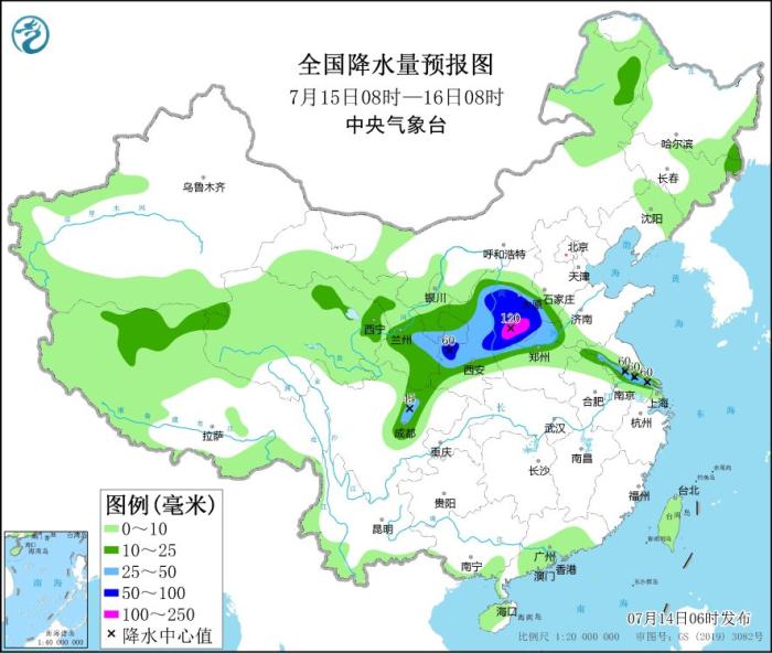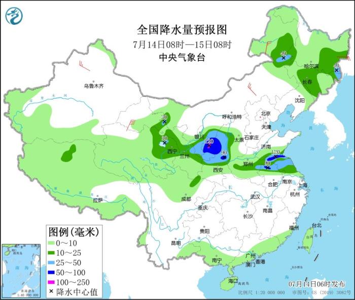 預(yù)計,7月14日08時至15日08時,西北地區(qū)東部、江蘇北部、安徽北部等地部分地區(qū)有大到暴雨,其中,甘肅東部、陜西北部等地局地有大暴雨(100~120毫米)。上述部分地區(qū)伴有短時強降水(最大小時降雨量20~50毫米,局地可超過60毫米),局地有雷暴大風(fēng)等強對流天氣。中央氣象臺7月14日06時發(fā)布暴雨藍色預(yù)警。