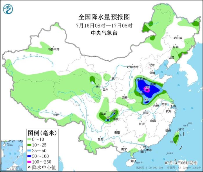 7月16日08時至17日08時,華北南部、黃淮大部、江淮大部、四川盆地南部、臺灣島中南部等地部分地區(qū)有中到大雨,其中,山西東南部、河北南部、山東西部、河南東北部和南部、安徽北部、江蘇北部等地部分地區(qū)有暴雨或大暴雨(100~150毫米)。