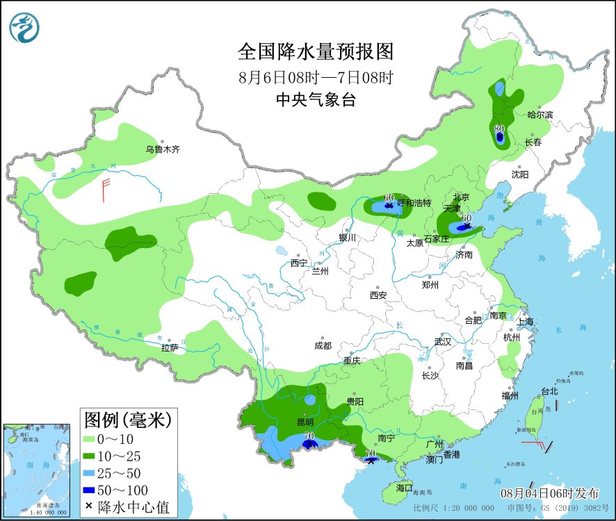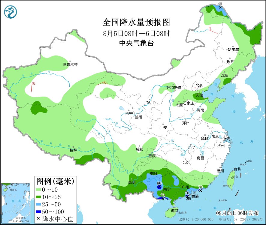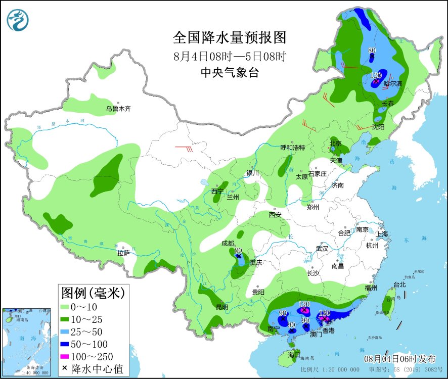 8月4日08時(shí)至5日08時(shí),內(nèi)蒙古東部、遼寧北部、吉林中西部、黑龍江中西部、北京東部、天津北部、福建東南部、廣東大部、廣西大部、四川盆地南部、云南北部和南部、青海東部等地有中到大雨,其中,吉林西部、黑龍江西部、廣東東南部和西部、廣西東部、四川盆地南部等地部分地區(qū)有暴雨,局地有大暴雨(100~130毫米)。甘肅西部、內(nèi)蒙古中東部等地部分地區(qū)有4~6級風(fēng)。