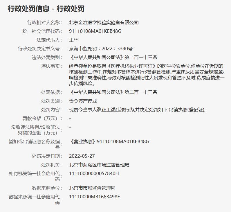 據(jù)信用中國(guó)(北京)網(wǎng)站5月31日行政處罰信息顯示,北京金準(zhǔn)醫(yī)學(xué)檢驗(yàn)實(shí)驗(yàn)室有限公司在近期的核酸檢測(cè)工作中,違規(guī)對(duì)多管樣本進(jìn)行3管混管檢測(cè),嚴(yán)重違反質(zhì)量安全規(guī)定,影響檢測(cè)結(jié)果準(zhǔn)確性,導(dǎo)致對(duì)核酸檢測(cè)陽(yáng)性人員發(fā)現(xiàn)和管控不及時(shí),造成疫情進(jìn)一步傳播風(fēng)險(xiǎn)。北京市海淀區(qū)市場(chǎng)監(jiān)督管理局決定吊銷其執(zhí)照(登記證)。(中新財(cái)經(jīng))