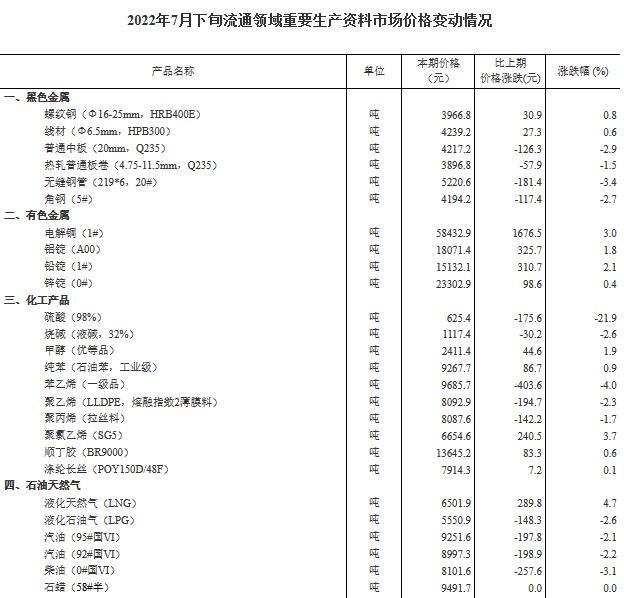中新網(wǎng)8月4日電 國家統(tǒng)計(jì)局4日公布2022年7月下旬流通領(lǐng)域重要生產(chǎn)資料市場(chǎng)價(jià)格變動(dòng)情況,據(jù)對(duì)全國流通領(lǐng)域9大類50種重要生產(chǎn)資料市場(chǎng)價(jià)格的監(jiān)測(cè)顯示,2022年7月下旬與7月中旬相比,15種產(chǎn)品價(jià)格上漲,32種下降,3種持平。