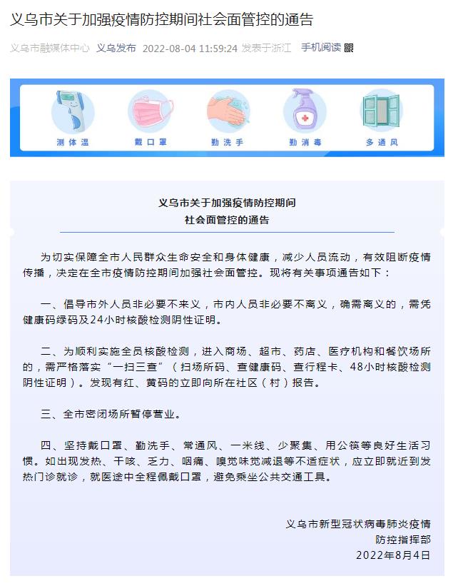 中新網(wǎng)8月4日電 據(jù)“義烏發(fā)布”微信公眾號消息,浙江省義烏市新型冠狀病毒肺炎疫情防控指揮部4日發(fā)布義烏市關(guān)于加強(qiáng)疫情防控期間社會(huì)面管控的通告。通告指出,為切實(shí)保障全市人民群眾生命安全和身體健康,減少人員流動(dòng),有效阻斷疫情傳播,決定在全市疫情防控期間加強(qiáng)社會(huì)面管控。