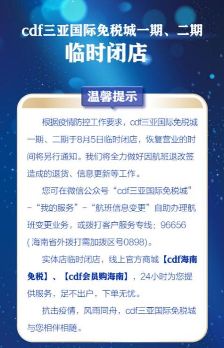 中新網(wǎng)8月5日電 cdf三亞國際免稅城官方微信公眾號消息,根據(jù)疫情防控要求,三亞國際免稅城一期、二期8月5日起臨時閉店,恢復營業(yè)時間將另行通知,并將做好因航班退改簽造成的退貨、信息更新等工作。(中新財經(jīng))