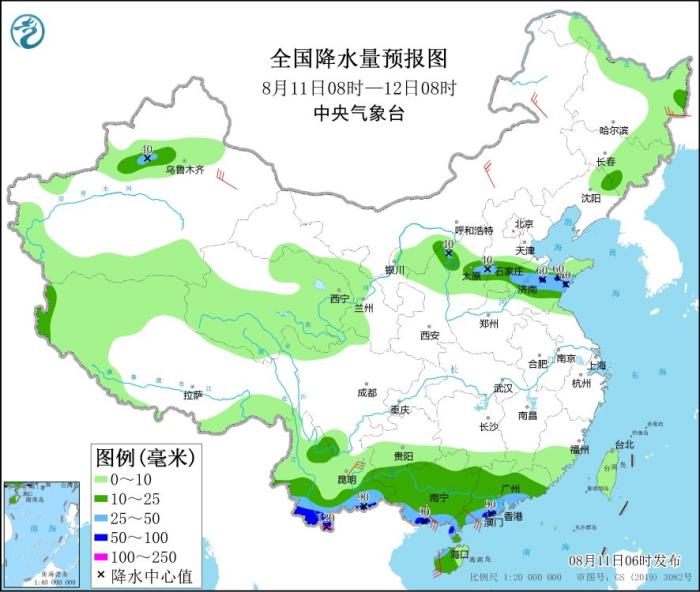 8月11日08時至12日08時,云南南部、廣西南部、廣東西南部沿海以及山西中部、河北南部、山東中部等地部分地區(qū)有大到暴雨,其中,云南南部局地有大暴雨(100~120毫米)。內(nèi)蒙古中東部、新疆東部、云南中南部、廣西南部、廣東西南部沿海、海南島西部等地部分地區(qū)有4~6級風(fēng),局地風(fēng)力可達(dá)6~7級。