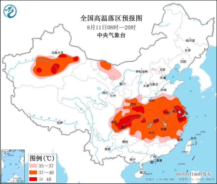 預(yù)計8月11日白天,新疆南疆盆地、內(nèi)蒙古西部、陜西中南部、河南中南部、安徽、江蘇、上海、四川中東部、重慶、湖北、湖南、江西、浙江、福建中北部、貴州北部等地有35~39℃高溫天氣,其中,陜西東南部、湖北西部和南部、四川東部、重慶、江蘇南部、安徽中部、浙江北部等地的部分地區(qū)可達(dá)40℃以上。中央氣象臺8月11日06時繼續(xù)發(fā)布高溫橙色預(yù)警。