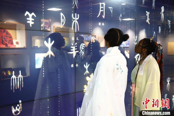 外國留學(xué)生通過觸摸電子屏幕體驗學(xué)習(xí)漢字文化、了解漢字的演變歷程?!∷逑?攝