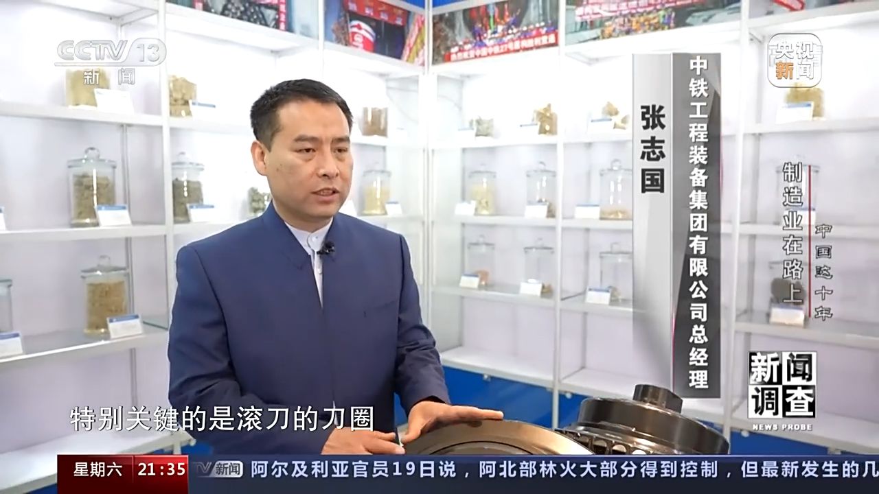 中鐵工程裝備集團有限公司總經(jīng)理 張志國:我們在研究這個刀圈的時候和清華大學等大的院校,專業(yè)的院校進行合作,經(jīng)過我們實驗以后我們2018年實現(xiàn)了國產(chǎn)化,目前整個中國市場上的刀具國產(chǎn)的刀具占到了90%。