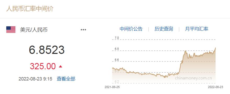 8月23日人民幣對美元中間價(jià)報(bào)6.8523 下調(diào)325個(gè)基點(diǎn)