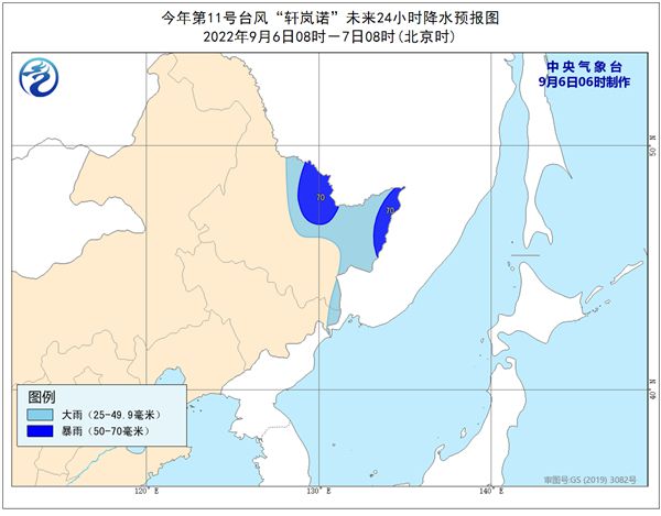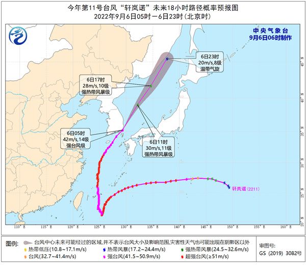 大風(fēng)預(yù)報(bào):9月6日08時(shí)至7日08時(shí),東海東北部、黃海中東部和東南部有6-7級(jí)大風(fēng),陣風(fēng)8-9級(jí);我國東北地區(qū)東北部有4-5級(jí)風(fēng),陣風(fēng)6-7級(jí),局地8級(jí)。朝鮮海峽、日本海大部有8-11級(jí)大風(fēng),“軒嵐諾”中心經(jīng)過的附近海面的風(fēng)力有12-14級(jí),陣風(fēng)可達(dá)15-16級(jí)。