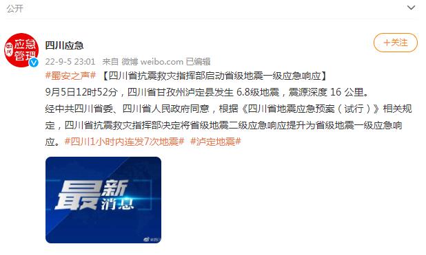 中新網(wǎng)9月5日電 據(jù)四川省應(yīng)急管理廳官方微博5日消息,9月5日12時52分,四川省甘孜州瀘定縣發(fā)生6.8級地震,震源深度16公里。
