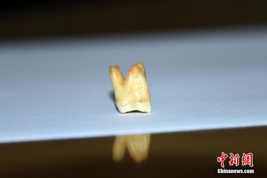 中國科學院古脊椎動物與古人類研究所(中科院古脊椎所)青年研究員吳妍帶領(lǐng)的研究團隊,通過對湖南道縣福巖洞遺址出土的、迄今所知東亞最早現(xiàn)代人(8-12萬年前)的牙齒化石進行牙結(jié)石提取與分析,最新研究發(fā)現(xiàn)東亞最早現(xiàn)代人植物類食物的直接證據(jù),并發(fā)現(xiàn)當時的古人類就已經(jīng)有了剔牙行為。這項重要研究發(fā)現(xiàn)的成果論文,已在國際專業(yè)學術(shù)期刊《植物科學前沿》發(fā)表。圖為9月7日,北京,中科院古脊椎所標本館,展示一顆用于本次研究的湖南道縣福巖洞遺址出土、8-12萬年前東亞最早現(xiàn)代人牙齒化石標本。 中新社記者 孫自法 攝