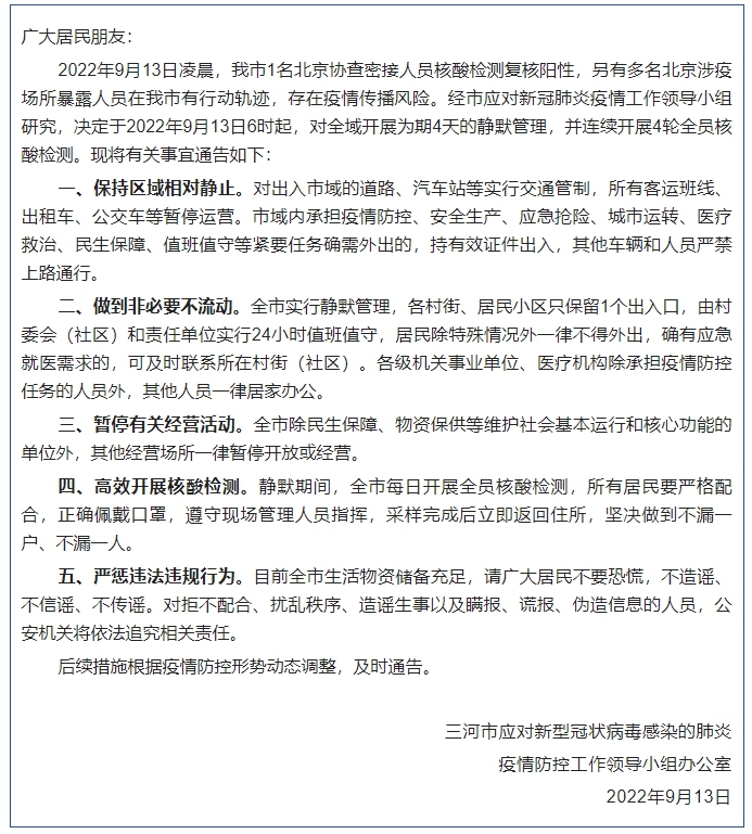 河北省三河市應(yīng)對(duì)新型冠狀病毒感染的肺炎疫情防控工作領(lǐng)導(dǎo)小組辦公室9月13日發(fā)布通告,決定于2022年9月13日6時(shí)起,對(duì)全域開展為期4天的靜默管理,并連續(xù)開展4輪全員核酸檢測(cè)。通告全文如下:
