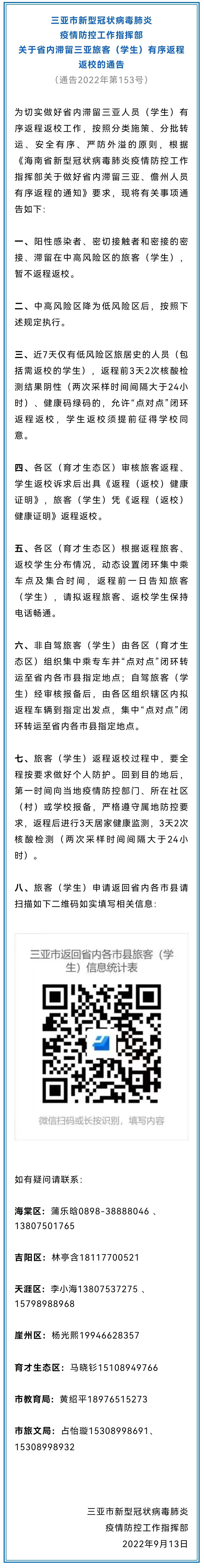 9月13日,總臺記者從三亞市新型冠狀病毒肺炎疫情防控工作指揮部獲悉, 為切實做好海南省內(nèi)滯留三亞人員(學(xué)生)有序返程返校工作,按照分類施策、分批轉(zhuǎn)運(yùn)、安全有序、嚴(yán)防外溢的原則,根據(jù)《海南省新型冠狀病毒肺炎疫情防控工作指揮部關(guān)于做好省內(nèi)滯留三亞、儋州人員有序返程的通知》要求,現(xiàn)將有關(guān)事項通告如下:
