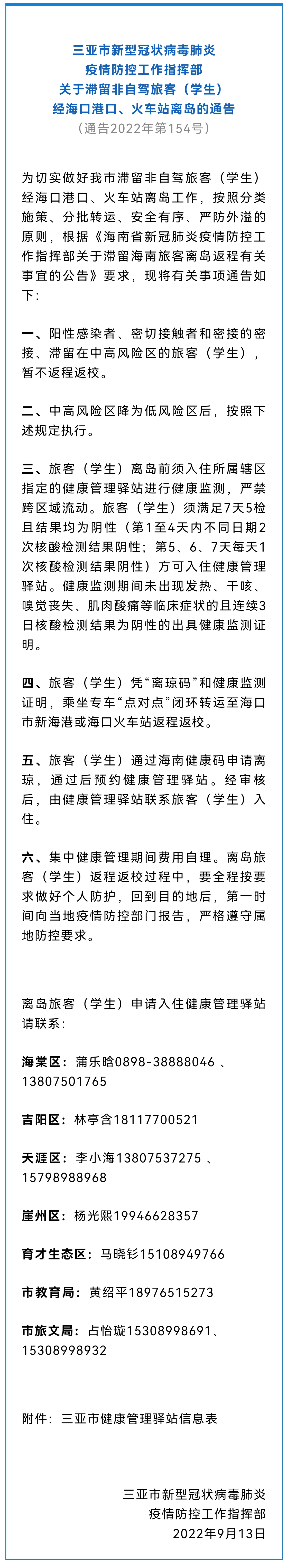 9月13日,總臺記者從三亞市新型冠狀病毒肺炎疫情防控工作指揮部獲悉,為切實做好三亞市滯留非自駕旅客(學(xué)生)經(jīng)??诟劭?、火車站離島工作,按照分類施策、分批轉(zhuǎn)運(yùn)、安全有序、嚴(yán)防外溢的原則,根據(jù)《海南省新冠肺炎疫情防控工作指揮部關(guān)于滯留海南旅客離島返程有關(guān)事宜的公告》要求,現(xiàn)將有關(guān)事項通告如下: