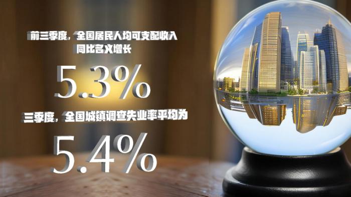 就業(yè)形勢總體穩(wěn)定,居民收入平穩(wěn)增長。前三季度,全國城鎮(zhèn)調(diào)查失業(yè)率平均為5.6%,其中三季度平均為5.4%,比二季度下降0.4個(gè)百分點(diǎn)。全國居民人均可支配收入27650元,同比名義增長5.3%;扣除價(jià)格因素實(shí)際增長3.2%,比上半年加快0.2個(gè)百分點(diǎn);全國居民人均可支配收入中位數(shù)23277元,同比名義增長5.1%。