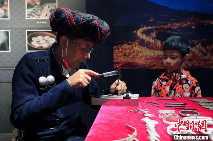 中新網(wǎng)涼山11月7日電 (王利文)“叮咚,叮咚……”6日,清脆的敲打聲從四川涼山民族體育場傳出,在“家園遺珍·時代新風”非遺展演活動中,彝族銀飾制作技藝國家級非遺傳承人勒古沙日正在打制銀器。鷹爪銀杯、鳳冠、胸牌……現(xiàn)場一件件閃亮精致的銀器均出自這位66歲老人之手。