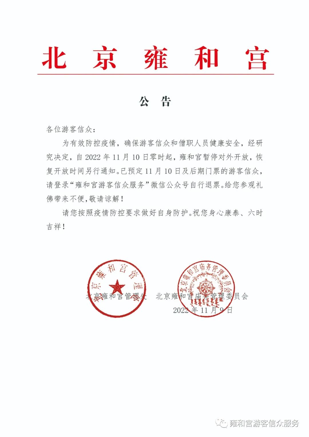 中新網(wǎng)11月9日電 據(jù)雍和宮游客信眾服務微信公眾號消息,為有效防控疫情,確保游客信眾和僧職人員健康安全,經(jīng)研究決定,自2022年11月10日零時起,雍和宮暫停對外開放,恢復開放時間另行通知。已預定11月10日及后期門票的游客信眾,請登錄“雍和宮游客信眾服務”微信公眾號自行退票。