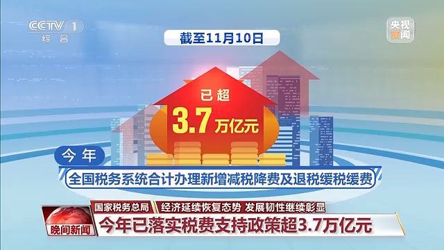國家稅務(wù)總局今天公布最新數(shù)據(jù),截至11月10日,今年全國稅務(wù)系統(tǒng)合計辦理新增減稅降費及退稅緩稅緩費已超3.7萬億元,各項稅費支持政策有效減輕了企業(yè)負(fù)擔(dān),增強了企業(yè)發(fā)展動能。