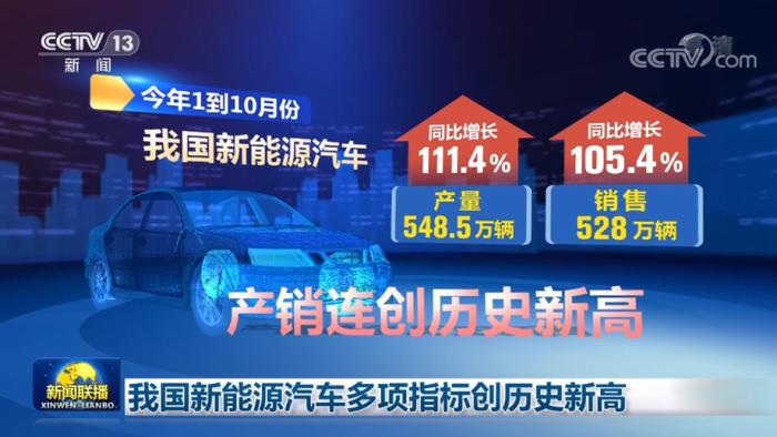 央視網(wǎng)消息(新聞聯(lián)播):今年前十個(gè)月,我國(guó)新能源汽車(chē)產(chǎn)銷(xiāo)量、出口量等多項(xiàng)指標(biāo)創(chuàng)歷史新高。