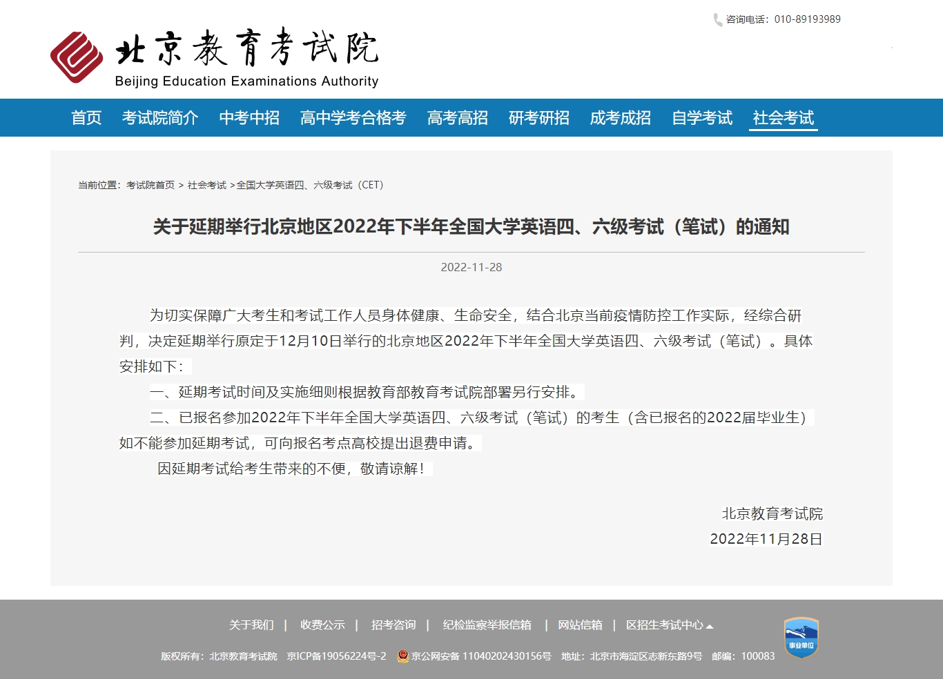 中新網(wǎng)11月28日電 據(jù)北京市教育考試院網(wǎng)站消息,北京教育考試院28日發(fā)布通知,為切實保障廣大考生和考試工作人員身體健康、生命安全,結合北京當前疫情防控工作實際,經(jīng)綜合研判,決定延期舉行原定于12月10日舉行的北京地區(qū)2022年下半年全國大學英語四、六級考試(筆試)。具體安排如下: