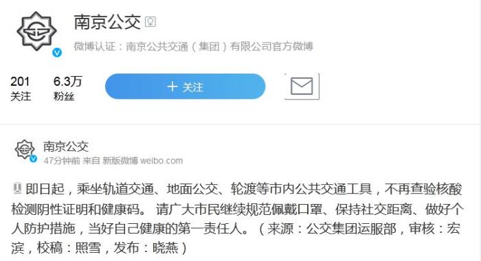 南京:5日起,乘坐市內(nèi)公共交通工具不再查驗核酸證明和健康碼