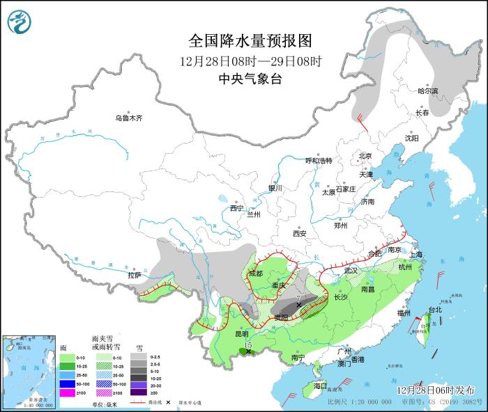 12月28日08時至29日08時,內(nèi)蒙古東北部、黑龍江中東部和北部、西藏東部、川西高原大部、云南北部、貴州、湖南西部、重慶東南部、湖北西南部、江西北部、安徽南部、浙江西部等地部分地區(qū)有小雪或雨夾雪,其中,湖南西部、貴州中東部、云南東北部等地局地有中雪或大雪(5~7毫米)。江南大部、西南地區(qū)大部、廣西大部、廣東北部、海南島西部和東部、臺灣島東部等地部分地區(qū)有小雨,其中,云南東南部、臺灣島東部局地有中雨或大雨。內(nèi)蒙古中部等地部分地區(qū)有4~5級風(fēng)。東海南部、臺灣海峽及以東洋面、巴士海峽、南海中北部等地部分地區(qū)有6~7級風(fēng)(見圖1)。