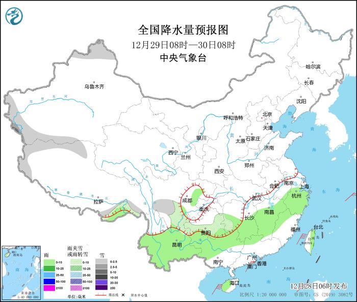 12月29日08時至30日08時,新疆北疆北部和南疆山區(qū)、西藏西北部和東南部、川西高原南部、云南東北部、貴州中南部等地部分地區(qū)有小雪或雨夾雪,其中,新疆阿勒泰和南疆山區(qū)等地局地有中雪或大雪。江南大部、四川盆地中部、云南大部、貴州南部、華南北部、海南島西部、臺灣島東部等地部分地區(qū)有小雨,其中,臺灣島東部局地有中雨。東海南部、臺灣海峽及以東洋面、巴士海峽、南海大部等地部分地區(qū)有6~7級風(fēng)(見圖2)。