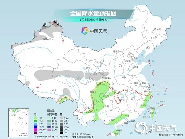 今起三天,我國(guó)降水區(qū)域仍將集中在西南地區(qū),新疆等部分地區(qū)降雪也比較頻繁。其中今天,新疆北部、西藏東南部、青海中部、甘肅南部、陜西西南部等地部分地區(qū)有小到中雪或雨夾雪,其中,新疆北疆北部等高海拔地區(qū)有大到暴雪(10~16毫米)。四川盆地、重慶西部、貴州中西部、云南東部、海南島、臺(tái)灣島等地部分地區(qū)有小雨。