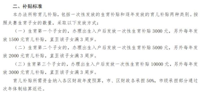 辦法擬規(guī)定,按照夫妻生育子女的數(shù)量,發(fā)放育兒補(bǔ)貼。其中,生育第一個(gè)子女的,辦理出生入戶后發(fā)放一次性生育補(bǔ)貼3000元,另外每年發(fā)放1500元育兒補(bǔ)貼,直至該子女滿3周歲;生育第二個(gè)子女的,辦理出生入戶后發(fā)放一次性生育補(bǔ)貼5000元,另外每年發(fā)放2000元育兒補(bǔ)貼,直至該子女滿3周歲;生育第三個(gè)子女的,辦理出生入戶后發(fā)放一次性生育補(bǔ)貼10000元,另外每年發(fā)放3000元育兒補(bǔ)貼,直至該子女滿3周歲。育兒補(bǔ)貼所需資金納入各區(qū)財(cái)政年度預(yù)算,市、區(qū)財(cái)政各承擔(dān)50%,市級(jí)承擔(dān)部分通過次年體制結(jié)算返還。(中新財(cái)經(jīng))