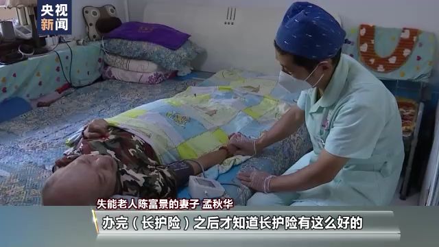 失能老人陳富景的妻子 孟秋華:護(hù)理員一來(lái)就幫他揉,我就輕松多了,白天來(lái)的好幾個(gè)小時(shí)我能休息,辦完長(zhǎng)護(hù)險(xiǎn)后才知道長(zhǎng)護(hù)險(xiǎn)這么好,又解決家庭經(jīng)濟(jì)困難,還有人幫著照顧,我說(shuō)老頭子有救了。