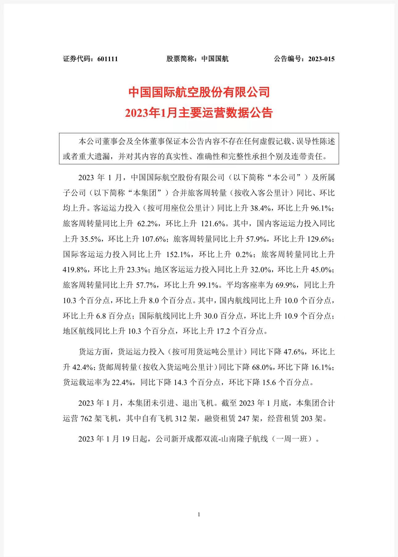 公告顯示,2023年1月,中國國航及所屬子公司合并旅客周轉(zhuǎn)量(按收入客公里計)同比、環(huán)比均上升??瓦\運力投入(按可用座位公里計)同比上升38.4%,環(huán)比上升96.1%;旅客周轉(zhuǎn)量同比上升62.2%,環(huán)比上升121.6%。