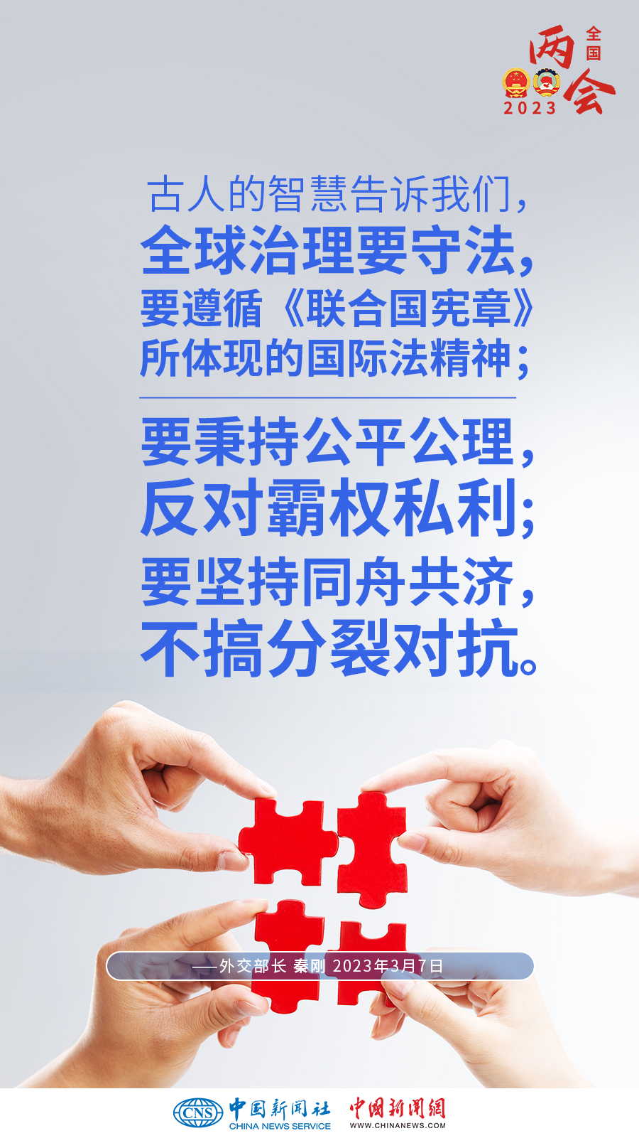 秦剛:古人的智慧告訴我們,全球治理要守法,要遵循《聯(lián)合國憲章》所體現(xiàn)的國際法精神;要秉持公平公理,反對霸權私利;要堅持同舟共濟,不搞分裂對抗。