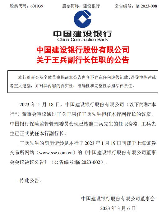 建設(shè)銀行6日發(fā)布的公告顯示,2023年1月18日,建設(shè)銀行董事會審議通過了關(guān)于聘任王兵擔(dān)任建設(shè)銀行副行長的議案。中國銀保監(jiān)會現(xiàn)已核準(zhǔn)王兵的任職資格,王兵已正式就任建設(shè)銀行副行長。