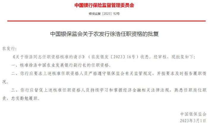 中國銀保監(jiān)會6日公布的《中國銀保監(jiān)會關(guān)于農(nóng)發(fā)行徐浩任職資格的批復(fù)》顯示,核準(zhǔn)徐浩中國農(nóng)業(yè)發(fā)展銀行副行長的任職資格。(中新財經(jīng))