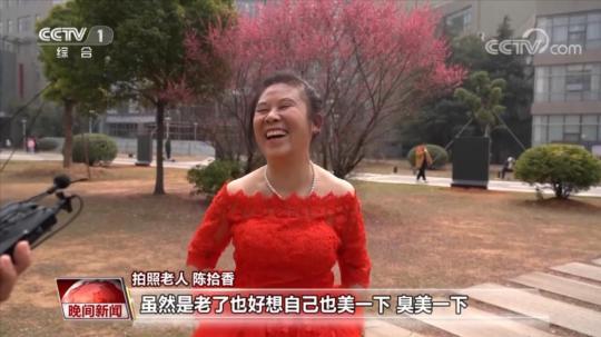 拍照老人 陳拾香:我們以前是農(nóng)村的,做夢也沒想到穿婚紗照相的。我這是第一次(穿婚紗),我今天可是特別開心。雖然是老了,也好想自己也美一下。