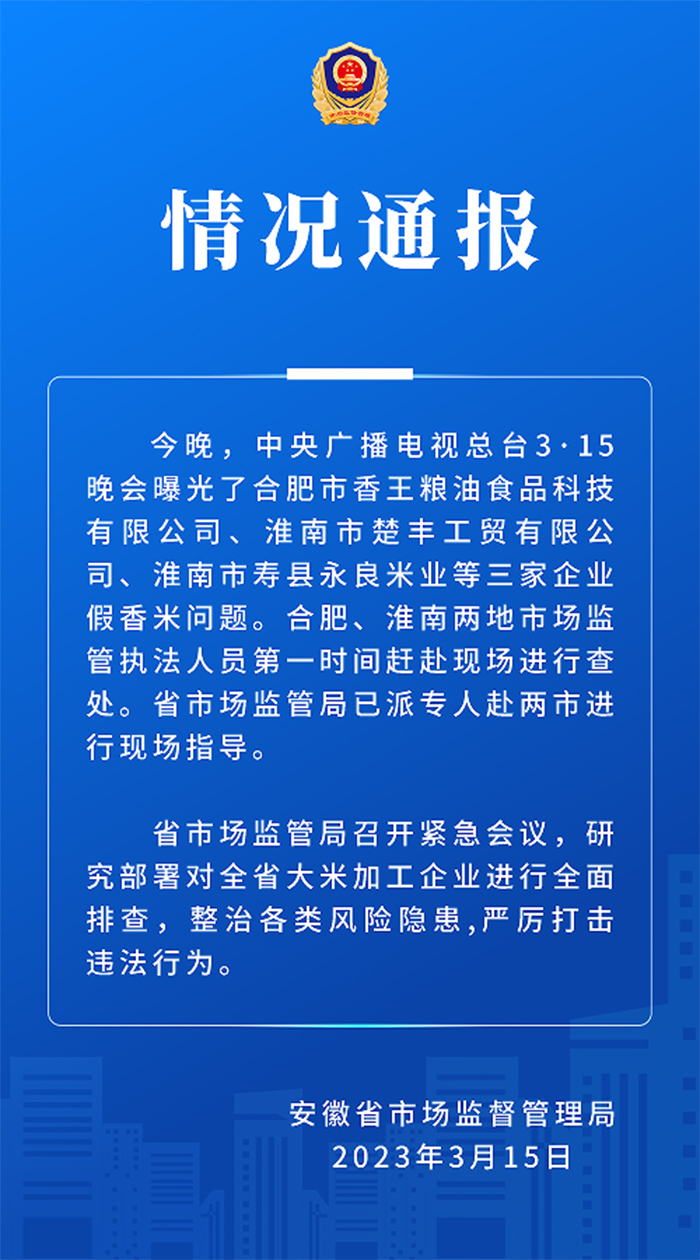 聲明還稱,安徽省市場監(jiān)管局召開緊急會(huì)議,研究部署對全省大米加工企業(yè)進(jìn)行全面排查,整治各類風(fēng)險(xiǎn)隱患,嚴(yán)厲打擊違法行為。(中新財(cái)經(jīng))