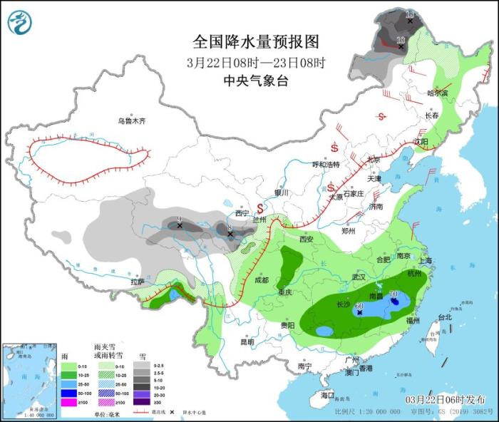 3月22日08時至23日08時,內(nèi)蒙古東北部、黑龍江西北部、西藏東部、西北地區(qū)中部等地的部分地區(qū)有小到中雪,其中,內(nèi)蒙古東北部、黑龍江西北部、青海南部等地的部分地區(qū)有大到暴雪(10~18毫米)。西藏東南部、江南中南部、貴州東南部、廣西東北部等地的部分地區(qū)有中到大雨,局部有暴雨(50~70毫米)。內(nèi)蒙古中東部、東北地區(qū)西部、華北等地的部分地區(qū)有4~6級風,其中,內(nèi)蒙古東北部等地部分地區(qū)有6~7級風。