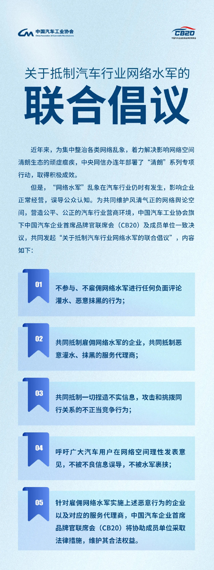 中新網(wǎng)3月24日電(中新財經(jīng) 葛成) 24日,中新財經(jīng)從中汽協(xié)獲悉,為共同維護風(fēng)清氣正的網(wǎng)絡(luò)輿論空間,營造公平、公正的汽車行業(yè)營商環(huán)境,中國汽車工業(yè)協(xié)會旗下中國汽車企業(yè)首席品牌官聯(lián)席會(CB20)及成員單位一致決議,共同發(fā)起“關(guān)于抵制汽車行業(yè)網(wǎng)絡(luò)水軍的聯(lián)合倡議”。
