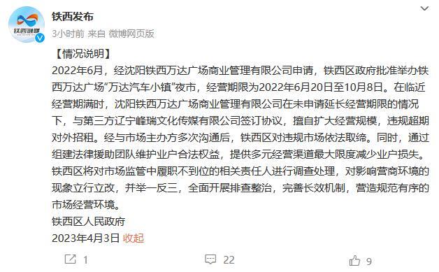 中新網(wǎng)4月3日電 鐵西發(fā)布官方微博3日發(fā)布情況說明:2022年6月,經(jīng)沈陽鐵西萬達(dá)廣場(chǎng)商業(yè)管理有限公司申請(qǐng),鐵西區(qū)政府批準(zhǔn)舉辦鐵西萬達(dá)廣場(chǎng)“萬達(dá)汽車小鎮(zhèn)”夜市,經(jīng)營(yíng)期限為2022年6月20日至10月8日。在臨近經(jīng)營(yíng)期滿時(shí),沈陽鐵西萬達(dá)廣場(chǎng)商業(yè)管理有限公司在未申請(qǐng)延長(zhǎng)經(jīng)營(yíng)期限的情況下,與第三方遼寧峰瑞文化傳媒有限公司簽訂協(xié)議,擅自擴(kuò)大經(jīng)營(yíng)規(guī)模,違規(guī)超期對(duì)外招租。