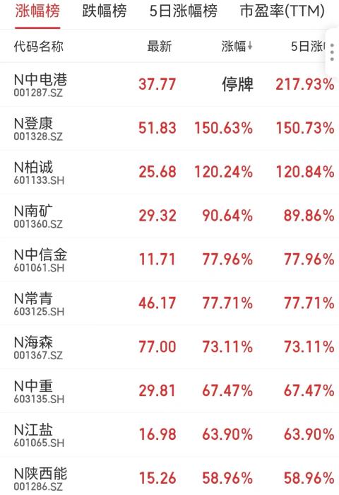 截至發(fā)稿時,N中電港停牌,N登康漲幅150.63%,N柏誠漲幅120.24%、N南礦漲幅90.64%,N中信金、N常青、N海森、N中重、N江鹽、N陜西能保持強(qiáng)勢上漲。
