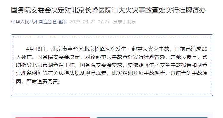 國(guó)務(wù)院安委會(huì)決定對(duì)北京長(zhǎng)峰醫(yī)院重大火災(zāi)事故查處實(shí)行掛牌督辦
