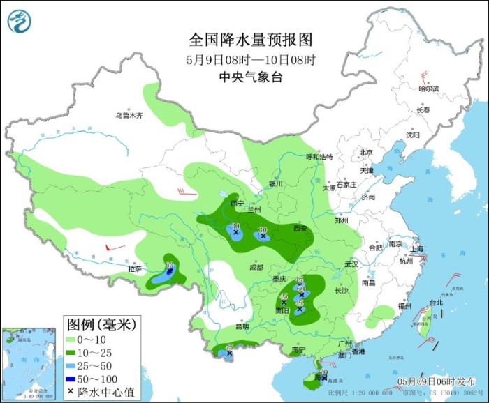 5月9日08時(shí)至10日08時(shí),甘肅西南部、青海東部和南部、西藏東部等地的部分地區(qū)有中到大雪或雨夾雪,其中青海東南部等地局地有暴雪;西北地區(qū)東南部、四川北部和東部、重慶、貴州中東部、湖南西部、云南南部、廣西北部和東南部、廣東西南部、海南島及西藏東南部等地的部分地區(qū)有中到大雨,其中,貴州東部、云南南部、海南島局地有暴雨(50~70毫米)。內(nèi)蒙古東北部、黑龍江大部、浙江北部、廣西東南部沿海等地部分地區(qū)有4~6級風(fēng),其中西藏中部部分地區(qū)有7~8級風(fēng)。