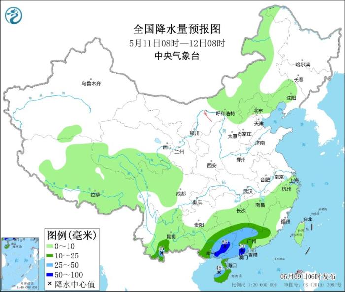全國降水量預(yù)報(bào)圖(5月9日08時(shí)-10日08時(shí))