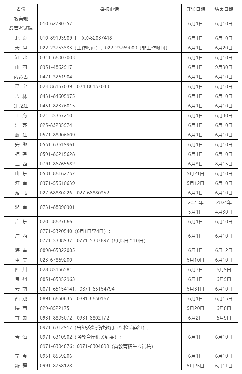 教育部和各省(區(qū)、市)開通2023年高考舉報(bào)電話