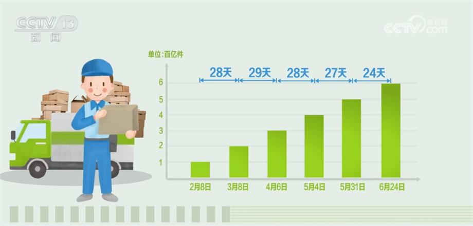 今年以來,從2月8日我國快遞業(yè)務(wù)量超100億件起,每個月快遞業(yè)務(wù)量都以百億件為增量。28天,快遞業(yè)務(wù)量從100億件到200億件(3月8日),29天達(dá)300億件(4月6日),28天從300億件到400億件(5月4日),27天達(dá)500億件(5月31日),從500億件到600億件(6月24日)只花了24天。