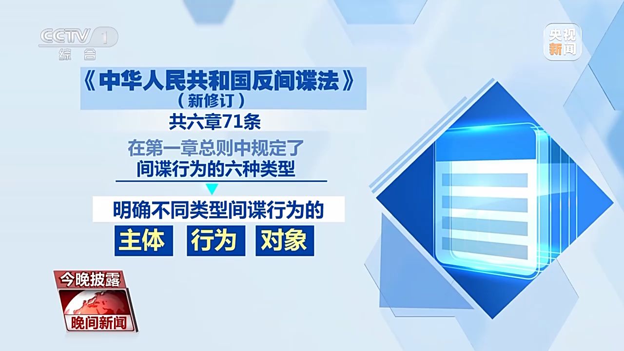 國家安全是安邦定國的重要基石。近年來,我國面臨的安全威脅日趨多元,反間諜斗爭形勢也更加嚴(yán)峻復(fù)雜。從本月起,新修訂的《反間諜法》開始施行。新法對間諜行為,做出進(jìn)一步充實和細(xì)化。那么按照新法,哪些行為將被認(rèn)定為間諜行為?作為普通群眾,一旦發(fā)現(xiàn)間諜行為,又該如何處理呢?今晚披露,一塊來關(guān)注。
