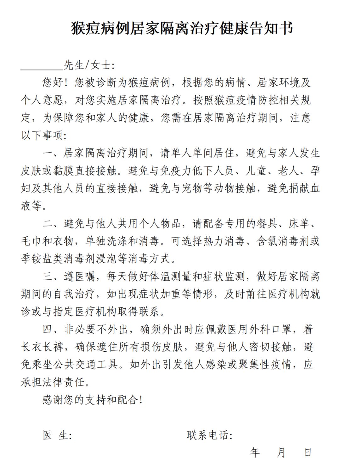 各地發(fā)現(xiàn)猴痘疑似病例和確診病例應(yīng)當(dāng)及時(shí)轉(zhuǎn)運(yùn)至醫(yī)療機(jī)構(gòu)進(jìn)行隔離治療,如臨床癥狀明顯好轉(zhuǎn),病變部位已結(jié)痂,可轉(zhuǎn)為居家隔離治療,直至皮疹結(jié)痂自然脫落,解除居家隔離。對(duì)病情較輕且具備居家隔離治療條件的確診病例,經(jīng)醫(yī)療機(jī)構(gòu)與疾控機(jī)構(gòu)聯(lián)合評(píng)估后,可直接采取居家隔離治療。對(duì)于實(shí)行居家隔離治療的確診病例發(fā)放《猴痘病例居家隔離治療健康告知書》(見附件2)。確診病例居家隔離治療期間,單人單間居住,避免與家人有皮膚或黏膜直接接觸,做好被污染物品的消毒,非必要不外出,確須外出時(shí)穿長(zhǎng)衣長(zhǎng)褲、佩戴醫(yī)用外科口罩,避免前往人群聚集場(chǎng)所,避免與其他人有皮膚或黏膜直接接觸;指定醫(yī)療機(jī)構(gòu)安排專人負(fù)責(zé)上門或電話隨訪,提供健康咨詢和醫(yī)療指導(dǎo)。