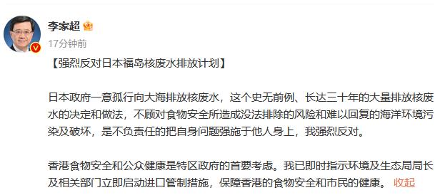 中新網(wǎng)8月22日電 香港特區(qū)行政長官李家超22日在社交媒體發(fā)文表示,強(qiáng)烈反對(duì)日本福島核廢水排放計(jì)劃。