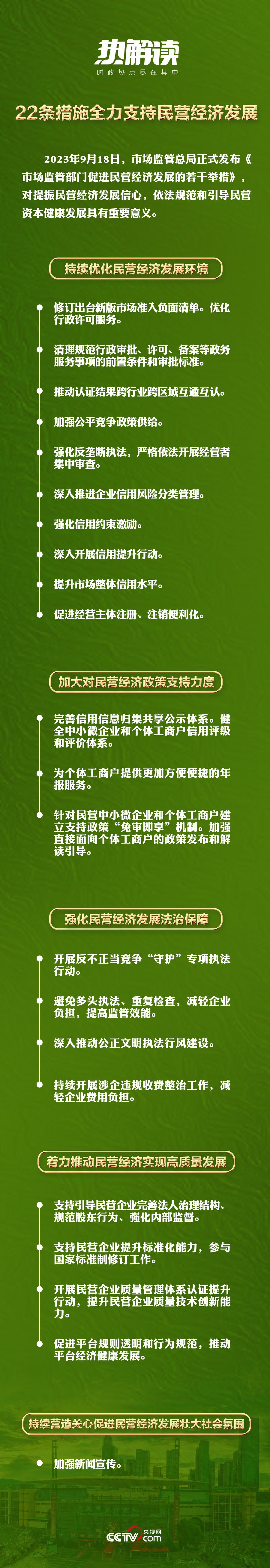 2023年7月14日,中共中央國務(wù)院出臺(tái)《關(guān)于促進(jìn)民營經(jīng)濟(jì)發(fā)展壯大的意見》,對(duì)促進(jìn)民營經(jīng)濟(jì)發(fā)展壯大作出新的重大部署。2023年9月18日,市場監(jiān)管總局發(fā)布《市場監(jiān)管部門促進(jìn)民營經(jīng)濟(jì)發(fā)展的若干舉措》,通過22條措施為全力支持民營經(jīng)濟(jì)發(fā)展設(shè)計(jì)了具體落實(shí)的“施工圖”。