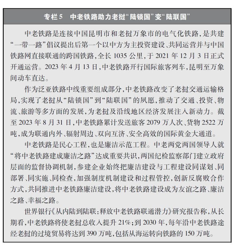 經(jīng)濟走廊和國際通道建設(shè)卓有成效。共建國家共同推進(jìn)國際骨干通道建設(shè),打造連接亞洲各次區(qū)域以及亞歐非之間的基礎(chǔ)設(shè)施網(wǎng)絡(luò)。中巴經(jīng)濟走廊方向,重點項目穩(wěn)步推進(jìn),白沙瓦-卡拉奇高速公路(蘇庫爾至木爾坦段)、喀喇昆侖公路二期(赫韋利揚-塔科特段)、拉合爾軌道交通橙線項目竣工通車,薩希瓦爾、卡西姆港、塔爾、胡布等電站保持安全穩(wěn)定運營,默拉直流輸電項目投入商業(yè)運營,卡洛特水電站并網(wǎng)發(fā)電,拉沙卡伊特別經(jīng)濟區(qū)進(jìn)入全面建設(shè)階段。新亞歐大陸橋經(jīng)濟走廊方向,匈塞鐵路塞爾維亞貝爾格萊德-諾維薩德段于2022年3月開通運營,匈牙利布達(dá)佩斯-克萊比奧段啟動軌道鋪設(shè)工作;克羅地亞佩列沙茨跨海大橋迎來通車一周年;雙西公路全線貫通;黑山南北高速公路順利建成并投入運營。中國-中南半島經(jīng)濟走廊方向,中老鐵路全線建成通車且運營成效良好,黃金運輸通道作用日益彰顯;作為中印尼共建“一帶一路”的旗艦項目,時速350公里的雅萬高鐵開通運行;中泰鐵路一期(曼谷-呵叻)簽署線上工程合同,土建工程已開工11個標(biāo)段(其中1個標(biāo)段已完工)。中蒙俄經(jīng)濟走廊方向,中俄黑河公路橋、同江鐵路橋通車運營,中俄東線天然氣管道正式通氣,中蒙俄中線鐵路升級改造和發(fā)展可行性研究正式啟動。中國-中亞-西亞經(jīng)濟走廊方向,中吉烏公路運輸線路實現(xiàn)常態(tài)化運行,中國-中亞天然氣管道運行穩(wěn)定,哈薩克斯坦北哈州糧油專線與中歐班列并網(wǎng)運行。孟中印緬經(jīng)濟走廊方向,中緬原油和天然氣管道建成投產(chǎn),中緬鐵路木姐-曼德勒鐵路完成可行性研究,曼德勒-皎漂鐵路啟動可行性研究,中孟友誼大橋、多哈扎里至科克斯巴扎爾鐵路等項目建設(shè)取得積極進(jìn)展。在非洲,蒙內(nèi)鐵路、亞吉鐵路等先后通車運營,成為拉動?xùn)|非乃至整個非洲國家縱深發(fā)展的重要通道。